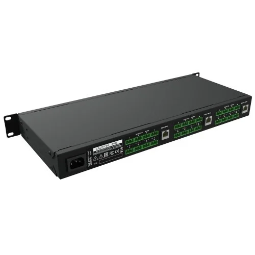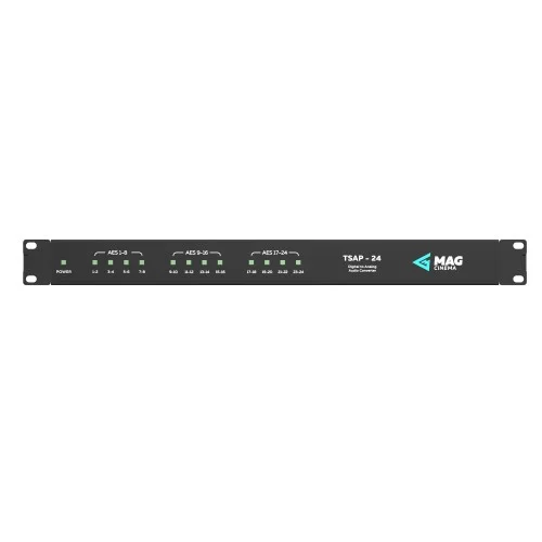 TSAP-24 is a 24-channel digital-to-analog convertor, which gives possibility to connect cinema processor with only analog inputs to digital cinema server output or to use internal processor of the server. Up to 12 AES/EBU digital audio inputs are accepted through RJ-45 socket. Output is served via easily accessed Phoenix sockets.