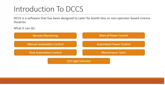 Digital Cinema Control System (DCCS) Designed to ease user operations by implementing local equipment monitoring and automated power on / off following the POS system schedule.